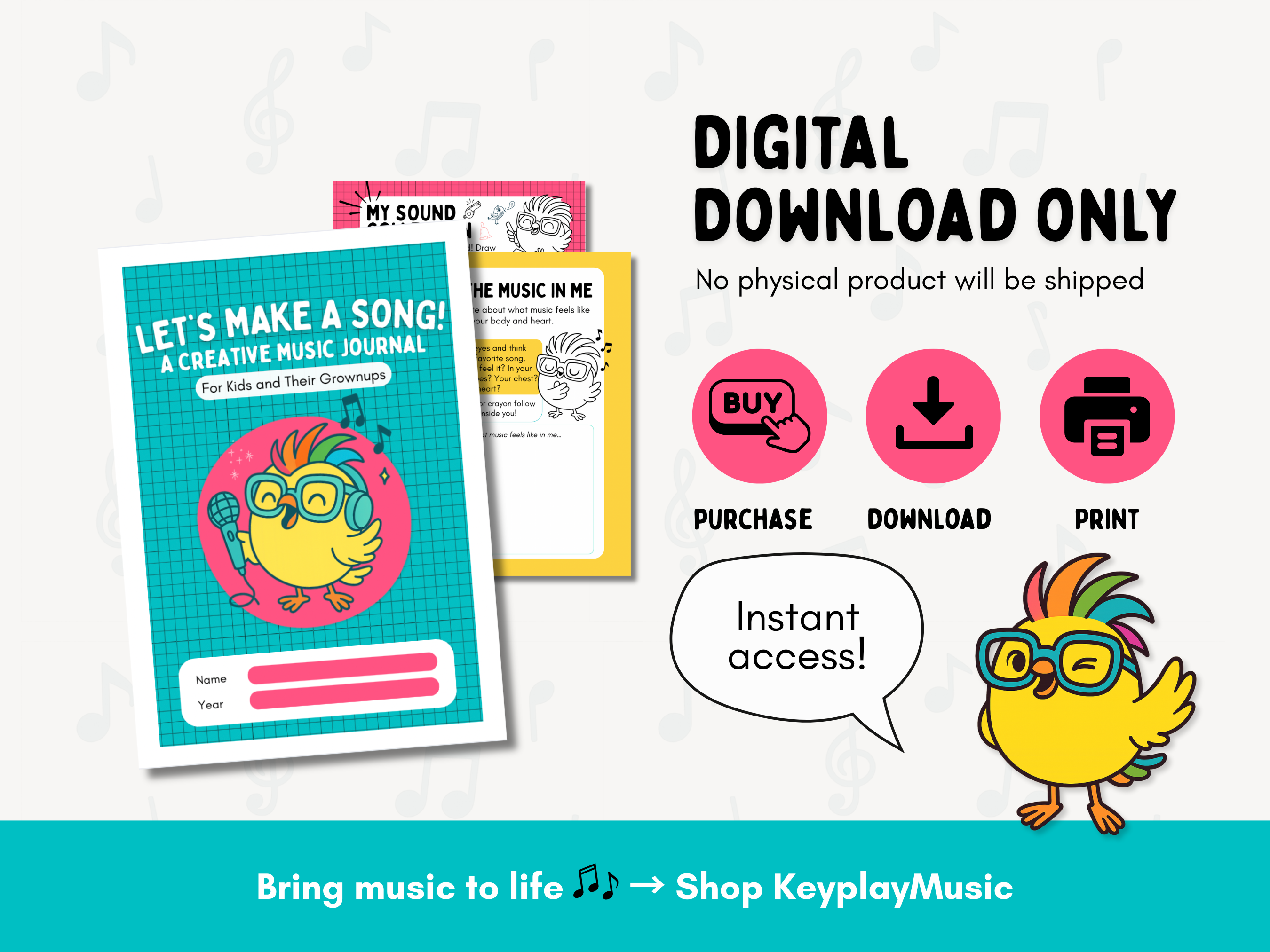 This 87-page full-color Creative Songwriting Journal invites kids ages 6โ12 (and their grownups!) to explore music, words, and imagination. With silly prompts, doodle-friendly pages, and QR code audio surprises from Key-Key the bird, kids can turn everyday ideas into songs.